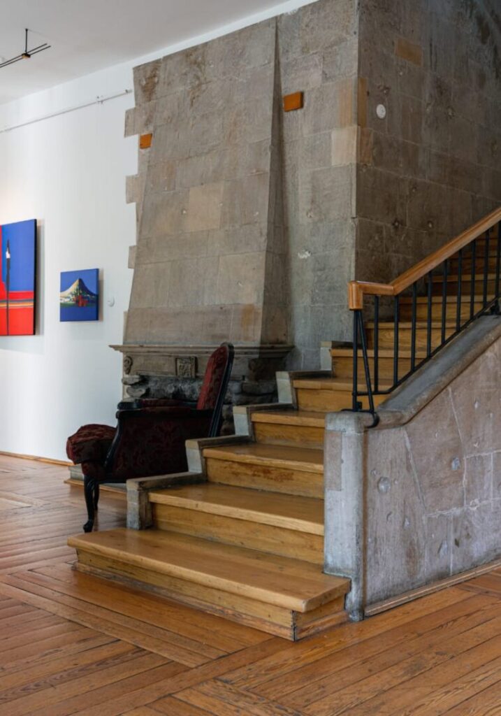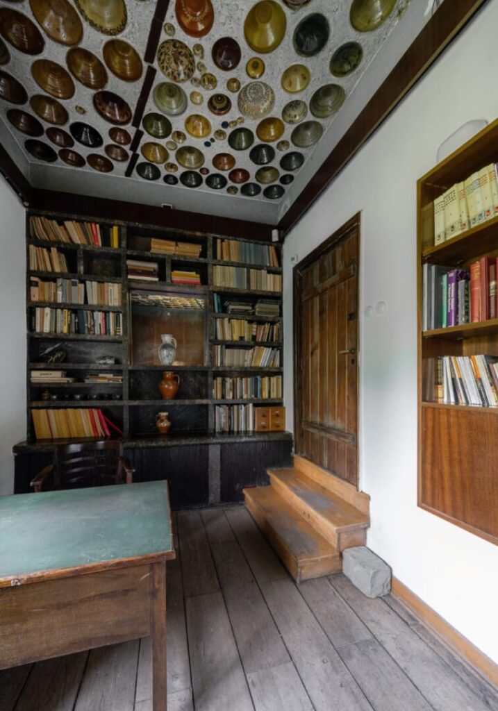 Najciekawszym miejscem w domu jest bez wątpienia gabinet – serce całej rezydencji, przestrzeń pracy i reprezentacji zarazem. Architekt urządził gabinet z niemal teatralnym wyczuciem scenografii: ciemne, rytmiczne boazerie, lekkie, modernistyczne meble na osi symetrii, i światło, które wlewa się przez wysokie okna, tworząc kompozycję półcieni i refleksów. W sufit wkomponowano niezwykły detal: ceramikę huculską, zatopioną w formie ozdobnych rozet. Ten etnograficzny akcent, żywy i barwny, przełamuje chłód nowoczesnych materiałów, dodając wnętrzu głębi i szlachetnej nieoczywistości.