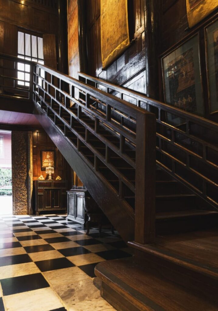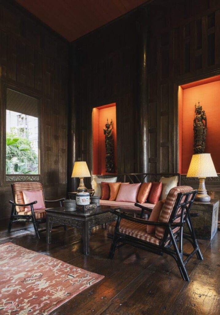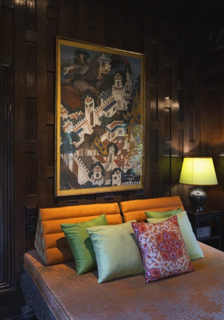 W jego posiadłości można dostrzec to, co definiowało samego Thompsona – fascynację Orientem widzianą oczami zachodu. Zachował po części tradycyjny podział przestrzeni na izby, ale jednocześnie ich układ i otwartość sprawiają, że odczuwa się niemalże zyskujący mocno na popularności plan otwarty. Thompson nie bał się eksperymentów. Ściany ustawione są odwrotnie niż w klasycznych tajskich domach – gładkie powierzchnie wewnętrzne, które zazwyczaj skrywają się przed wzrokiem, są tutaj eksponowane na zewnątrz. Do tego dodał europejskie rozwiązania: schody prowadzące na piętro, a nie drabinkę, i duże otwarte przestrzenie łączące wnętrza z otoczeniem.