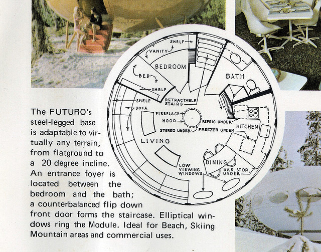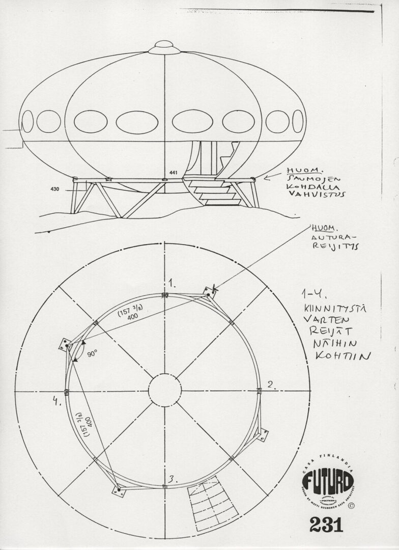 Projekt Futuro powstał z pragmatycznej potrzeby – na zamówienie. Zadaniem Suuronena było stworzenie lekkiego, mobilnego schronienia dla narciarzy, które można by postawić wysoko w górach. Postawił więc na tworzywa sztuczne – nowy, kuszący materiał lat 60., który obiecywał łatwość formowania, lekkość, odporność i futurystyczny połysk. Główna bryła miała kształt eliptycznego dysku o średnicy 8 metrów, a całość składała się z 16 prefabrykowanych segmentów, skręcanych na miejscu. Alternatywnie można było gotową konstrukcją przetransportować helikopterem na wcześniej przygotowane miejsce. Do tego okna owalne jak w samolocie, klapowe drzwi rodem z „Jetsonów” i plastikowe wnętrze z wbudowanymi meblami w odcieniach błękitu, pomarańczy lub żółcieni. Nie trudno doszukać się analogii do innych modułowych konstrukcji z tego okresu – Jugokiosków.