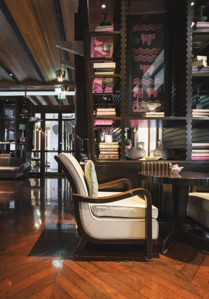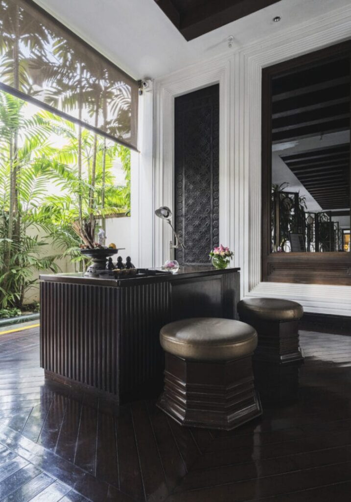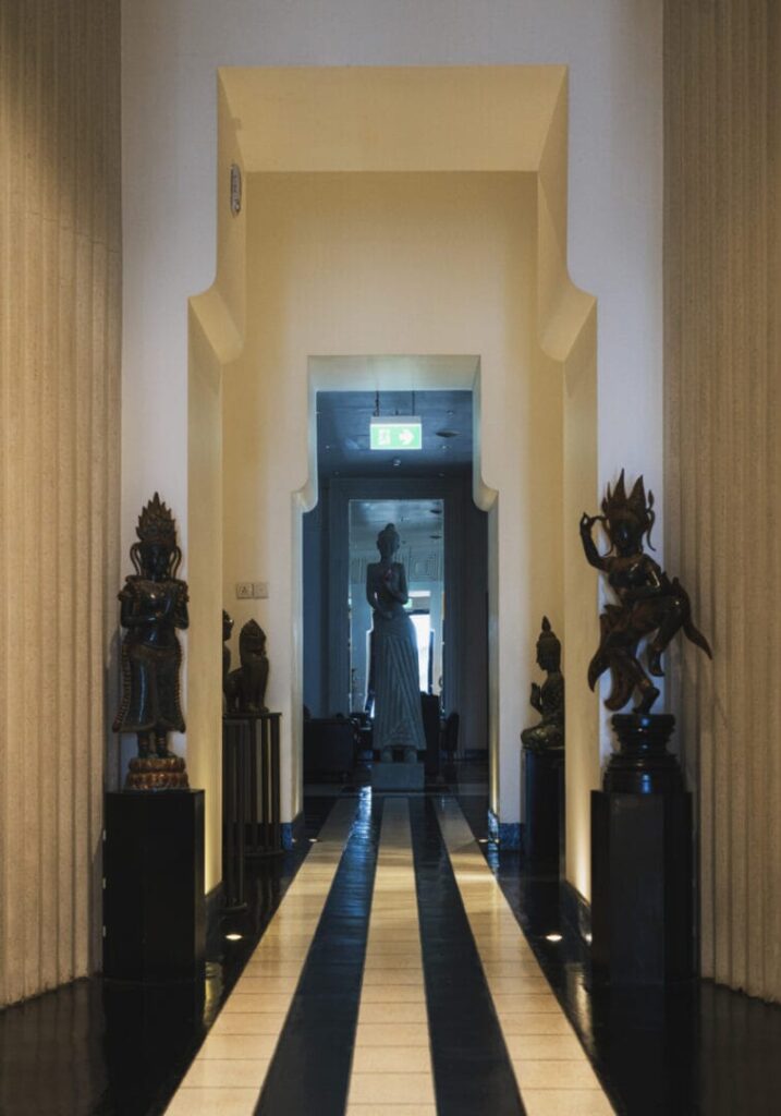 Hotel De La Paix to połączenie dwóch światów – francuskiego kolonializmu i khmerskiej tradycji. Fasada budynku czerpie z modernistycznych rezydencji z lat 30., ale najbliżej jej do kolonialnej odmiany stylu art deco. Zresztą geometria typowa dla tego stylu widoczna jest także w środku i uderza nas już od samego wejścia, kiedy znajdziemy się w ośmiokątnym holu z rzeźbą pośrodku. Strefa wejściowa dzięki temu zabiegowi niemalże przypomina świątynię, do której drzwi otwiera ponadprzeciętnie szarmancki personel. Całość została zaprojektowana z dbałością o detale, tak aby oddać ducha Kambodży, a jednocześnie zapewnić komfort na poziomie światowej klasy hotelu i sprostać wymaganiom turystów.