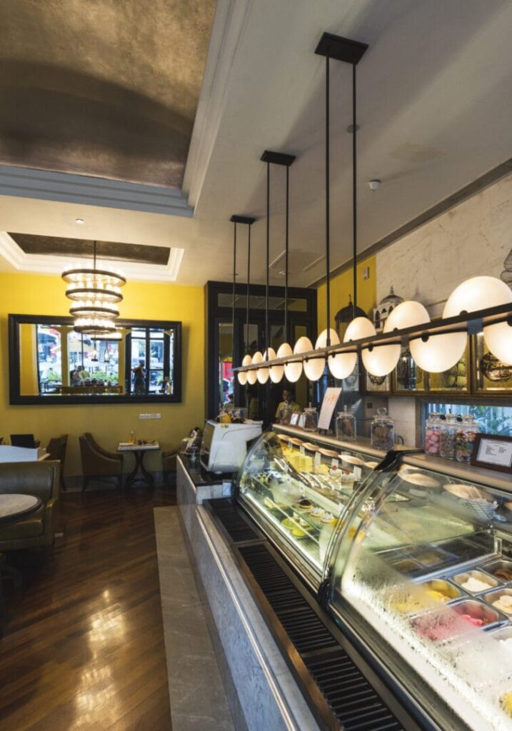 Pomiędzy dziedzińcem, a ulicą znajduje się część restauracyjna i salon dzienny. Szczególnie ten drugi jest wart uwagi, z indywidualnie projektowanymi meblami z litego drewna. W oczy rzuca się charakterystyczny stół przy barze, za którego nogi robią rzeźbione w drewnie atrapy kłów słonia. Z salonu można wyjść na taras, który jest odizolowany od ulicy dzięki wysokiemu murowi zasłoniętemu przez bujną roślinność. Wartą uwagi częścią hotelu jest ogólnodostępna kawiarnia z ekspresyjną lampą nad ladą chłodniczą.