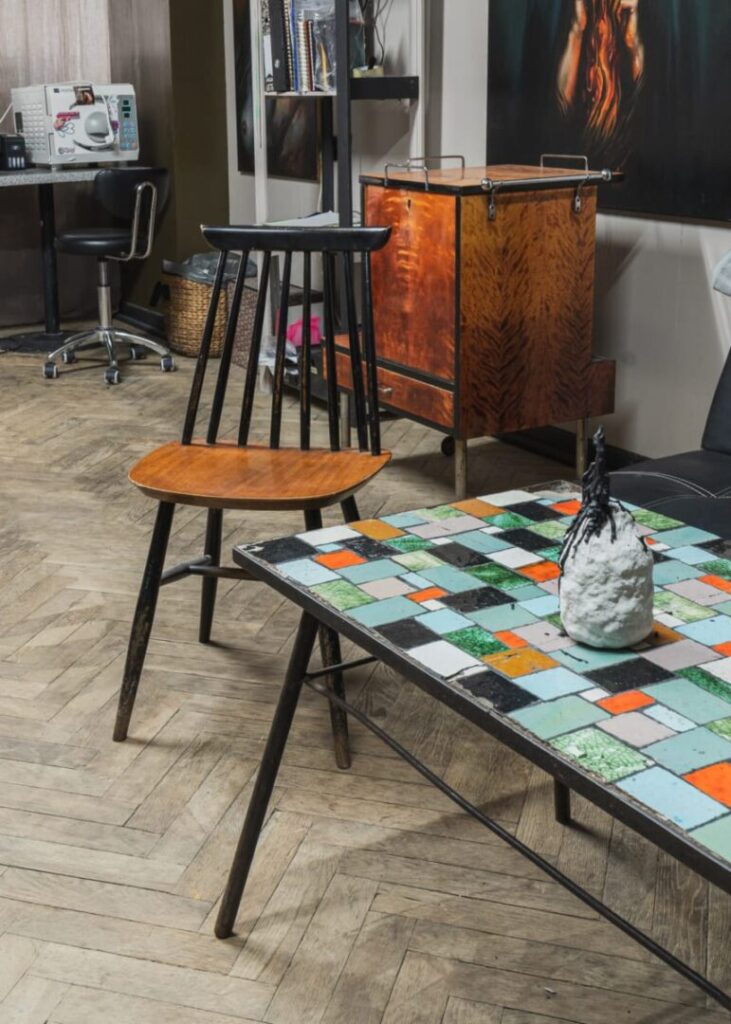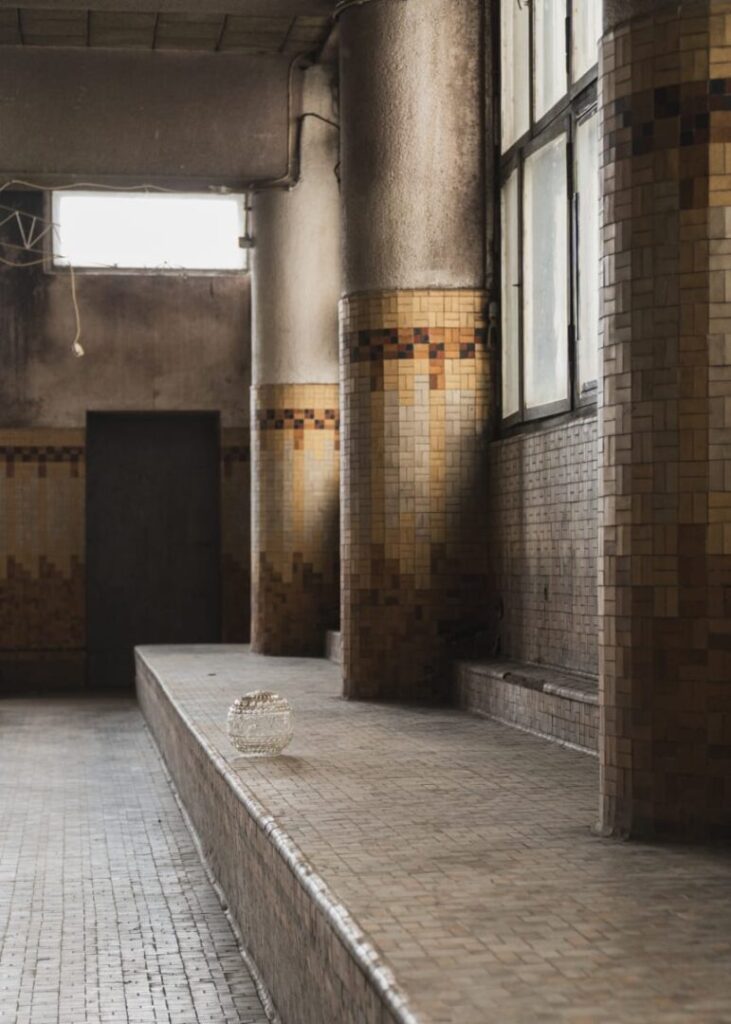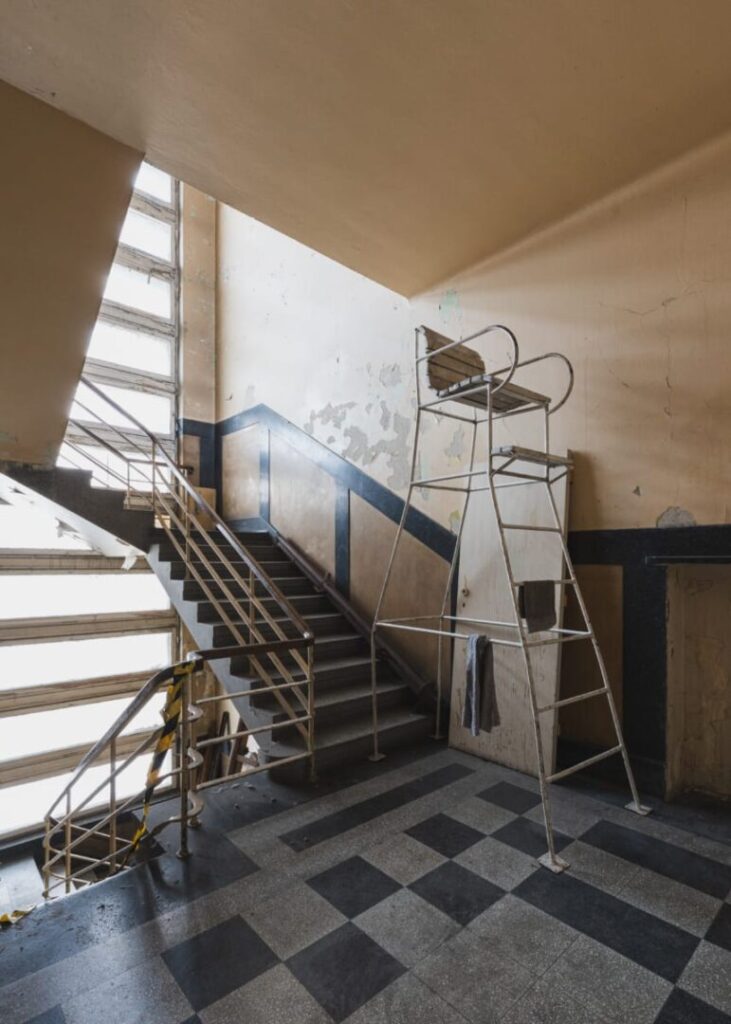 YMCA w Łodzi to nie tylko opuszczony basen z mozaikami. Niezwykła jest też sala gimnastyczna – przestrzeń, w której metaloplastyka z lat 30. spotyka się z boazerią z lat 70., a pod ścianą wciąż znajdują się drewniane drabinki do gimnastyki i ławeczki „Muflon”. To właśnie tu wielu łodzian miało pierwsze zajęcia wychowania fizycznego. Równocześnie budynek służy środowiskom artystycznym. W dawnych saunach i gabinetach działają dziś pracownie i galerie. Jedna z nich wciąż posiada marmurowy kominek z lat 30., inne zachowały oryginalne podziały, klamki czy listwy. To wnętrza, które się nie poddały i cały czas poszukują nowej tożsamości.