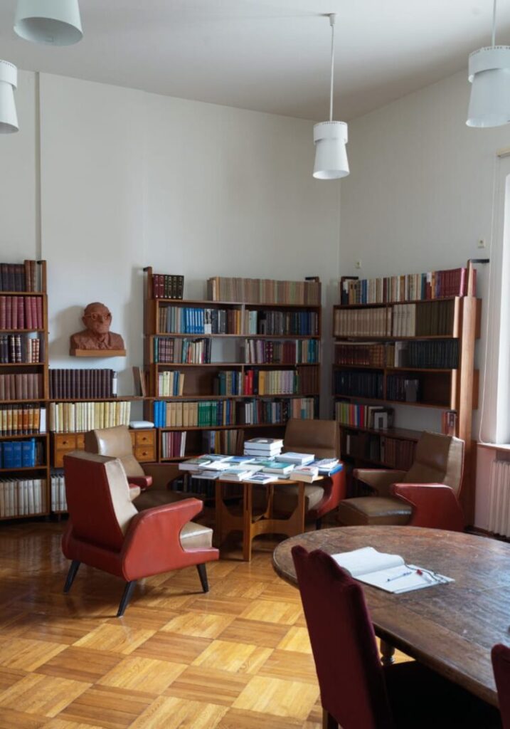 Inny rozdział tej historii dopisano po wojnie, kiedy zamek wymagał nie tylko konserwacji, ale też dostosowania do nowych funkcji instytucjonalnych. W latach 1962-64 budynek nr 5, sąsiadujący z głównym korpusem zamkowym, przeszedł generalny remont. Dawne pomieszczenia służbowe zmieniły się w biura, czytelnie i sale konferencyjne. Zamek zyskał nową bibliotekę – przestrzeń nie tylko do pracy badawczej, ale i reprezentacji instytucji, która coraz mocniej stawiała na działalność dydaktyczną.