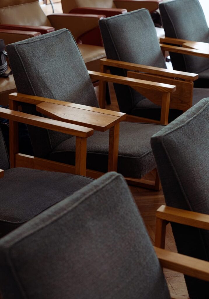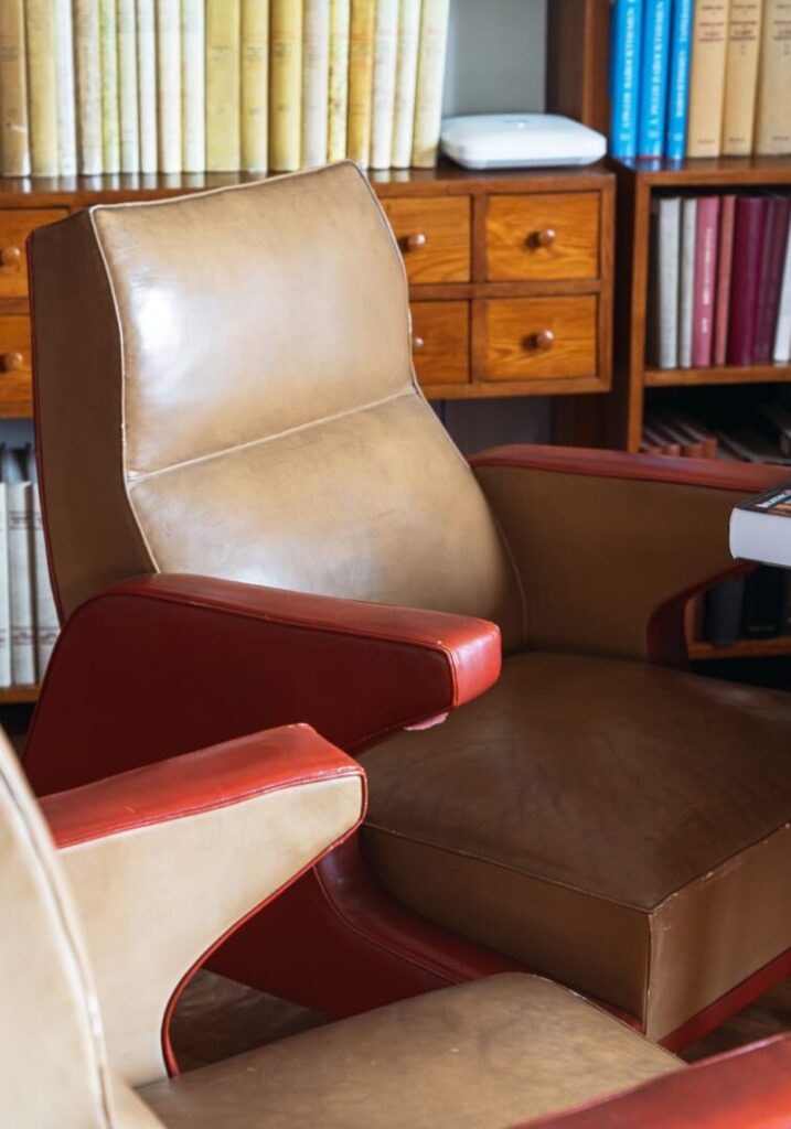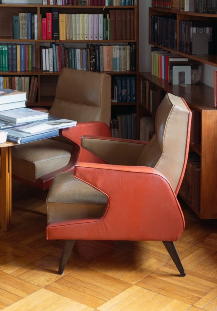 Za projekt wyposażenia odpowiadał Marian Sigmund, wybitny architekt wnętrz związany ze środowiskiem krakowskim. Stworzył zestaw mebli, które wciąż można podziwiać. Lekkie fotele o elegancko profilowanych podłokietnikach, wykończone czerwono-beżową skórą, drewniane ławy i szafy; minimalistyczne biurka oraz regały na książki o delikatnych, funkcjonalnych liniach. Charakterystyczne były też konferencyjne krzesła z ruchomą podpórką pod ramiona – detal, który zdradzał troskę o wygodę i ergonomię użytkownika.