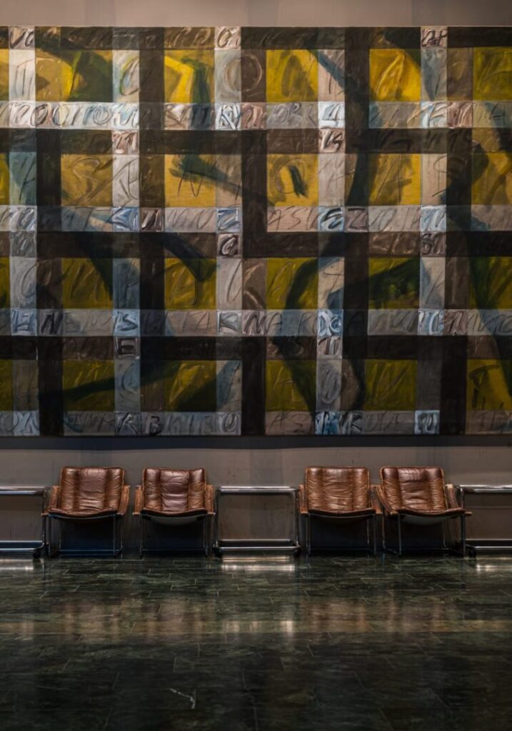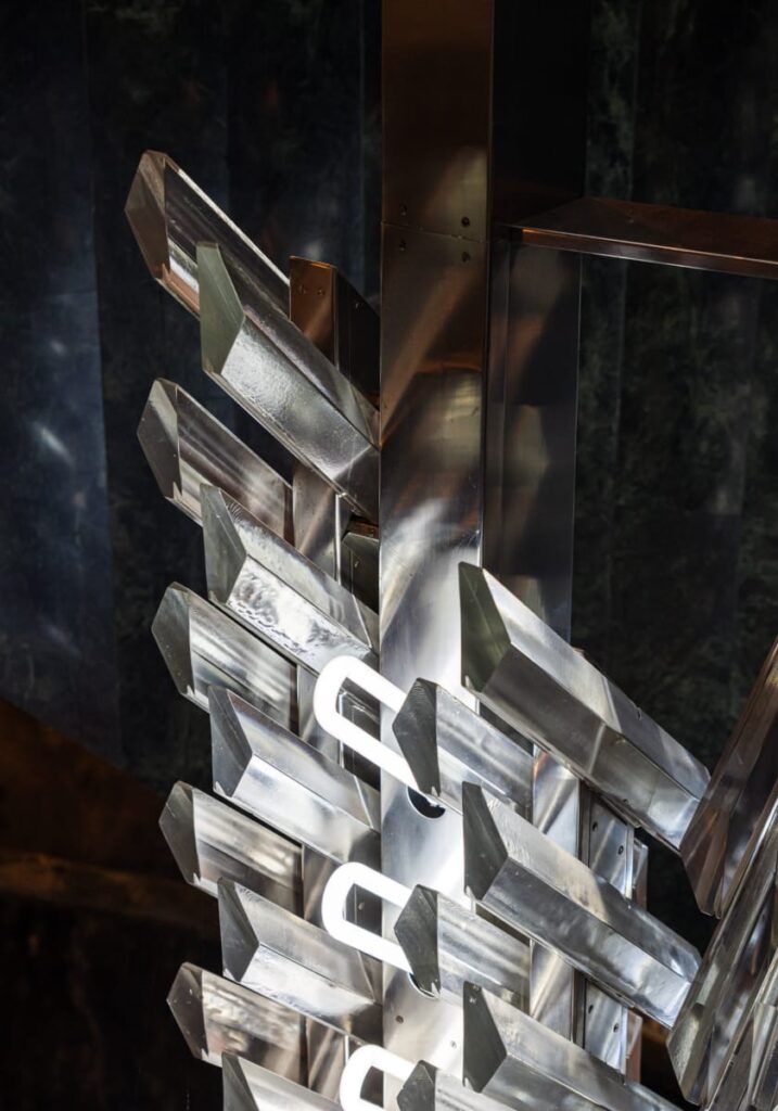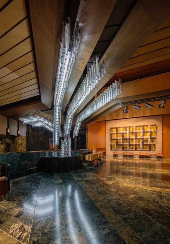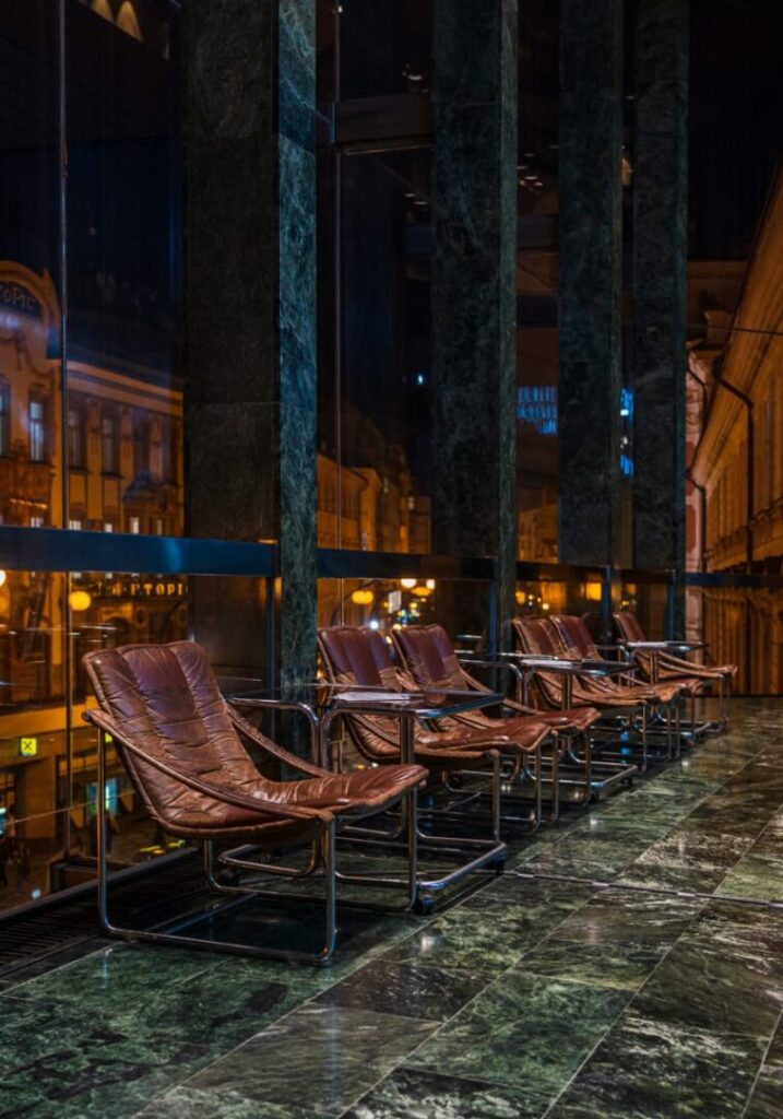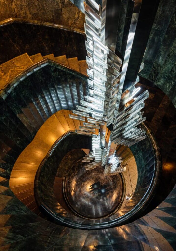 Wnętrze to osobna historia – esencja późnomodernistycznej elegancji. Składające się na nią zielony marmur, stal, szkło i światło układają się w teatralną scenografię. Monumentalny żyrandol przecina przestrzeń jak lodowa stalaktyta, z sufitu opadają geometryczne formy, a wzdłuż przeszklonego pasażu ustawiono rzędy skórzanych foteli, w których można wypić kawę z widokiem na złocone fasady starego miasta. W tej przestrzeni nie czuje się wagi jedynie spektaklu – to miejsce wyreżyserowane od wejścia. Na ścianach wiszą potężne gobeliny z geometrycznymi wzorami, które ocieplają to wnętrze zabierając mu nieco patosu, ale z korzyścią.