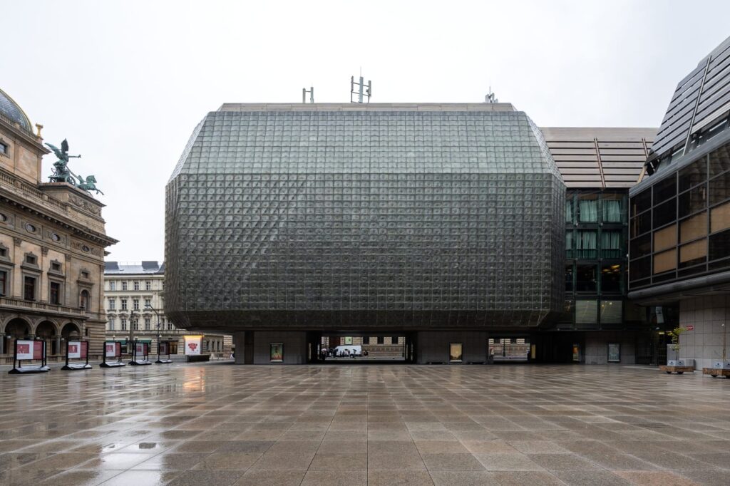 Szklany brutalizm w sercu starej Pragi