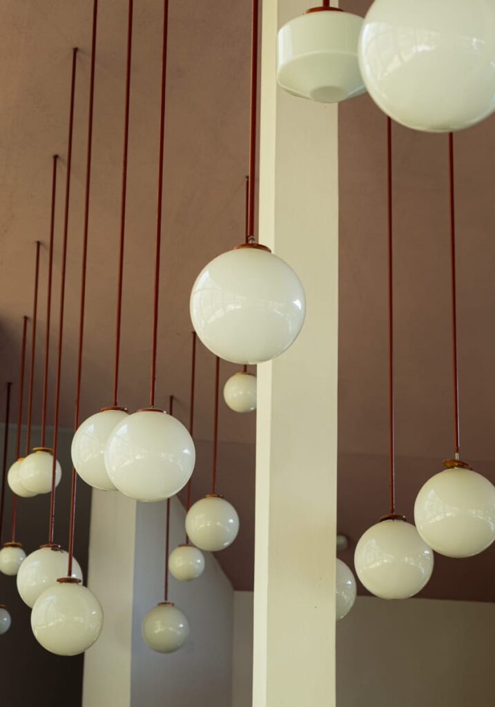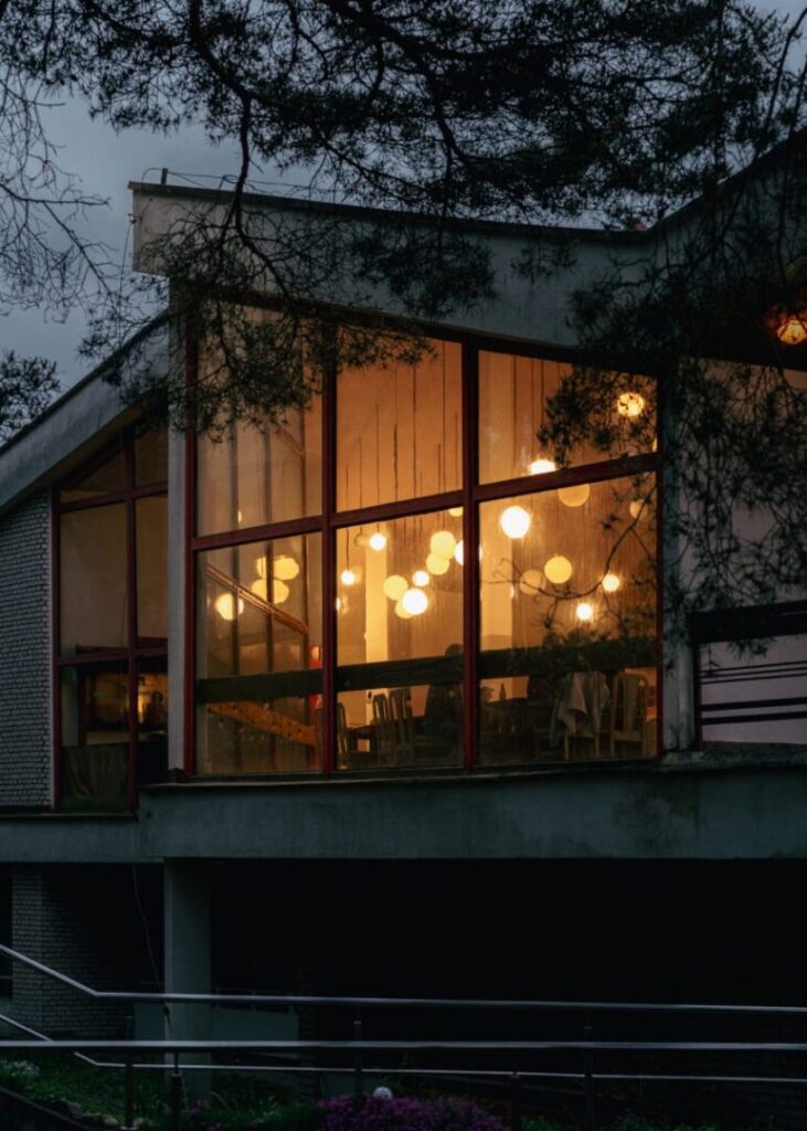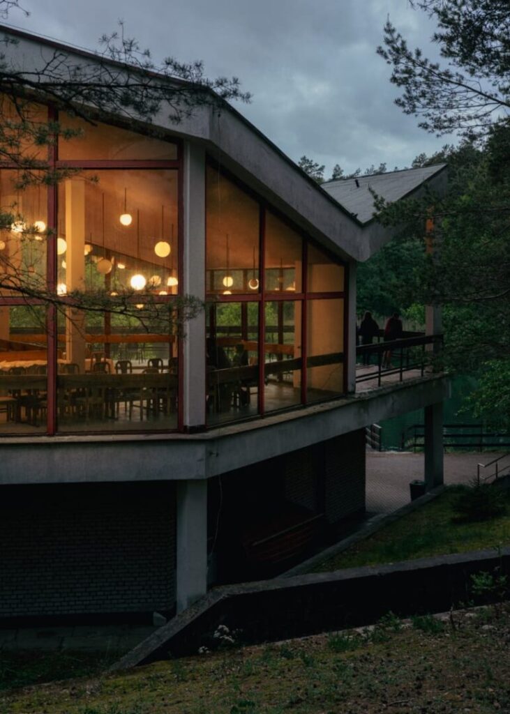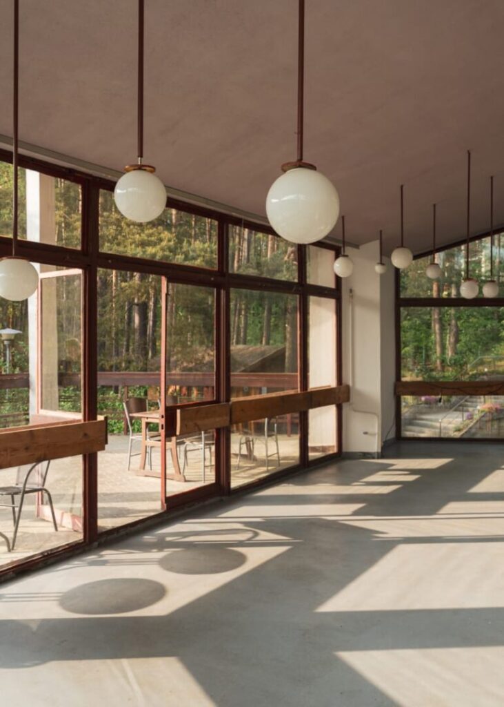 Ale serce całego kompleksu bije gdzie indziej. Tuż przy jeziorze, niemal zanurzone w zieleni i odbiciach fal, rozsiadła się świetlica-kawiarnia. Gdybym miał opisać ją jednym słowem to wybrałbym słowo dekonstrukcja? Nie ma tutaj kątów prostych typowych dla klasycznego corbusierowskiego funkcjonalizmu. Bryła jest rozczłonkowana, a przeszklone ściany rozchodzą się pod losowymi kątami tworząc wyjątkowo plastyczną przestrzeń. Wnętrze pełne jest szklanych kul – lamp zawieszonych tak gęsto, że przypominają deszcz zamrożony w locie. Przez ogromne przeszklenia wpada światło wydobywające światłocień z materiałów i mebli. Taras wychodzi prosto na jezioro, a przestrzeń ma w sobie coś z modernistycznej willi – tylko zamiast luksusu, mamy społeczny, egalitarny eksperyment.