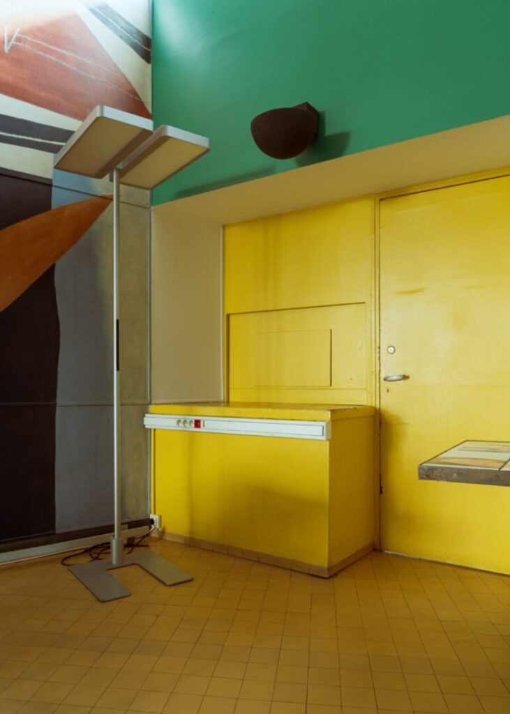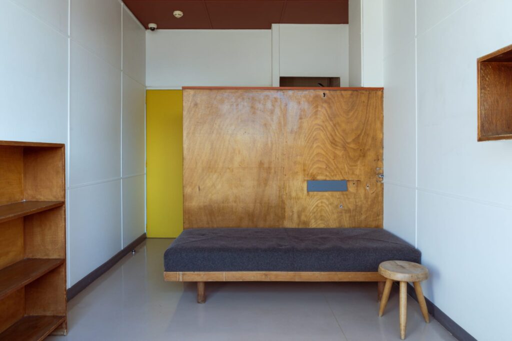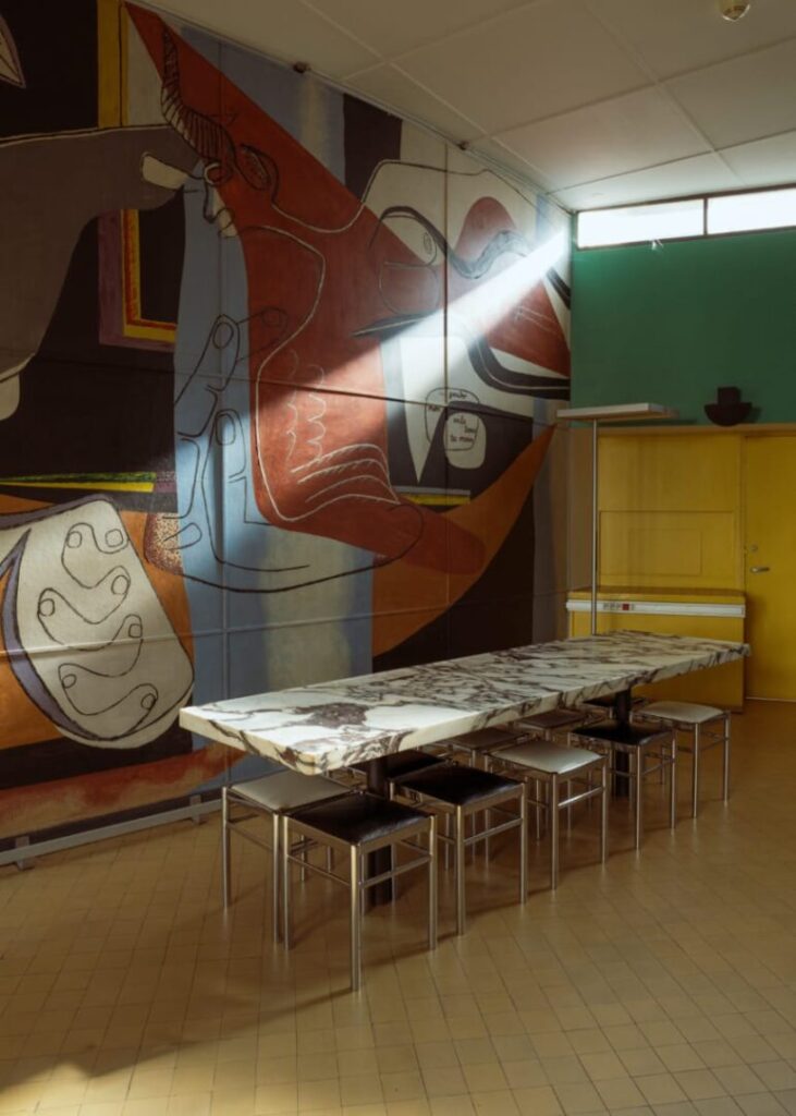 Wnętrze pawilonu – a zwłaszcza jego sala wspólna ozdobiona monumentalnym malowidłem – pokazuje, że Le Corbusier był również malarzem. Kolor, forma i przestrzeń współgrają tu w rytmicznym układzie, który przypomina o jego fascynacjach kubizmem i purystycznym minimalizmem. Co ciekawe, sam projekt wyposażenia wnętrz był tak precyzyjny, że zakładał nawet konkretny układ mebli i kolorystykę podłóg. Kompozycję domykają typowe dla lat 30. fotele na chromowanych rurach oraz marmurowy stół. Na parterze znajduje się również przestronny hol, pomieszczenia gospodarcze. Na wyższych piętrach zaprojektowano głównie jednoosobowe kwatery. Każda z własną mini-łazienkową, wyposażona w łóżko, szafę i biurko utrzymane w modnej wówczas kolorystyce.